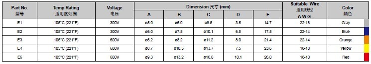 ■5种颜色标示各种型号■适用线径组合从22至10AWG■内含方型截面弹簧设计,可夹 紧电线,不易松脱■不需要预先扭转电线,电线旋入即可夹紧■较长的绝缘设计能预防感电,及减少电线折回造成短路的意外■耐用的绝缘外壳符合UL94 V2耐燃等级,适用温度至105°C(221°F) ■符合UL Listed 486C产品规范,并符合美国联邦W-S-610E规范