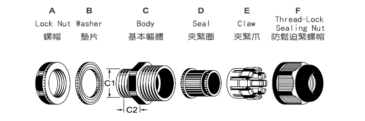 ■ 产品材质 : A.C.F 部分以 UL 认可之尼龙 PA66 制成 ( 防火等级 UL 94V-2 ),B 及 D 部分采用 EPDM 耐候橡胶制成。